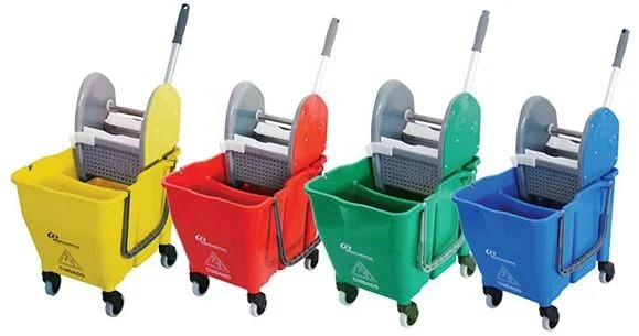 Balde com sistema de 2 águas com divisória para 18 e 12 litros; Espremedor com pressão superior, Um dreno de escoamento de água suja e Rodízios para facilitar seu deslocamento. A primeira divisória recebe água com o agente químico para limpeza do piso.