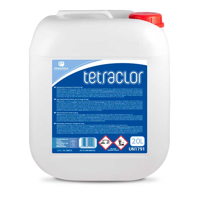 Branqueador químico baseado em hipoclorito de sódio estabilizado, eficiente a médias temperaturas. Contém uma alta concentração de agente oxidante: 1 g de TETRACLOR equivale a 2 g de uma lixívia de cloro habitual do mercado, tornando-o especialmente eficaz nas manchas de corantes.